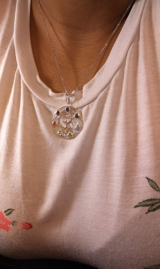 Ohm & Seven Chakras Sterling Silver Gemstone Necklace