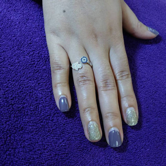 Evil Eye Hamsa CZ Turkish Design Sterling Silver Adjustable Ring